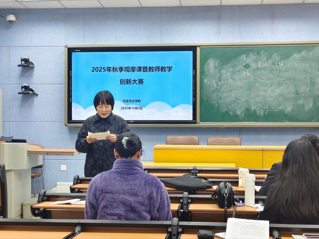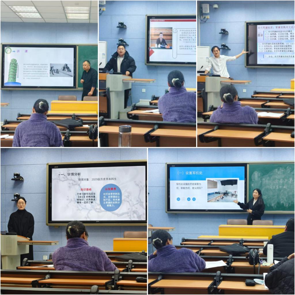按照比賽規(guī)則,五位參賽教師依次進(jìn)行說課和模擬授課。李國東老師進(jìn)行了細(xì)致的學(xué)情分析,以《教育實(shí)驗(yàn)研究》為例,系統(tǒng)地闡述了其理論內(nèi)涵、方法特點(diǎn)與實(shí)踐程序。楊文超老師以《中華民族共同體概論》課程中的“五胡入華與中華民族大交融”為主題,講述了“五胡”政權(quán)融入華夏的主動(dòng)性,引導(dǎo)學(xué)生深化對(duì)中華民族大交融的認(rèn)識(shí)。高天老師創(chuàng)新性地以《AI史學(xué)論文撰寫》為主題,以AI生成的“宋代軍旗色彩”主題論文為例,揭示了AI在史料真實(shí)性與邏輯推理上的缺陷。張彥曉老師講述了《清朝君主集權(quán)的發(fā)展》,充分體現(xiàn)了其對(duì)教材的深度把握、對(duì)學(xué)情的精準(zhǔn)分析以及運(yùn)用多樣化教學(xué)方法的能力。過軒老師創(chuàng)設(shè)“歷史法庭”情景,以《史記》“通古今之變”的智慧,培養(yǎng)學(xué)生鑒古知今思維,體現(xiàn)了思辨性引導(dǎo)特色。