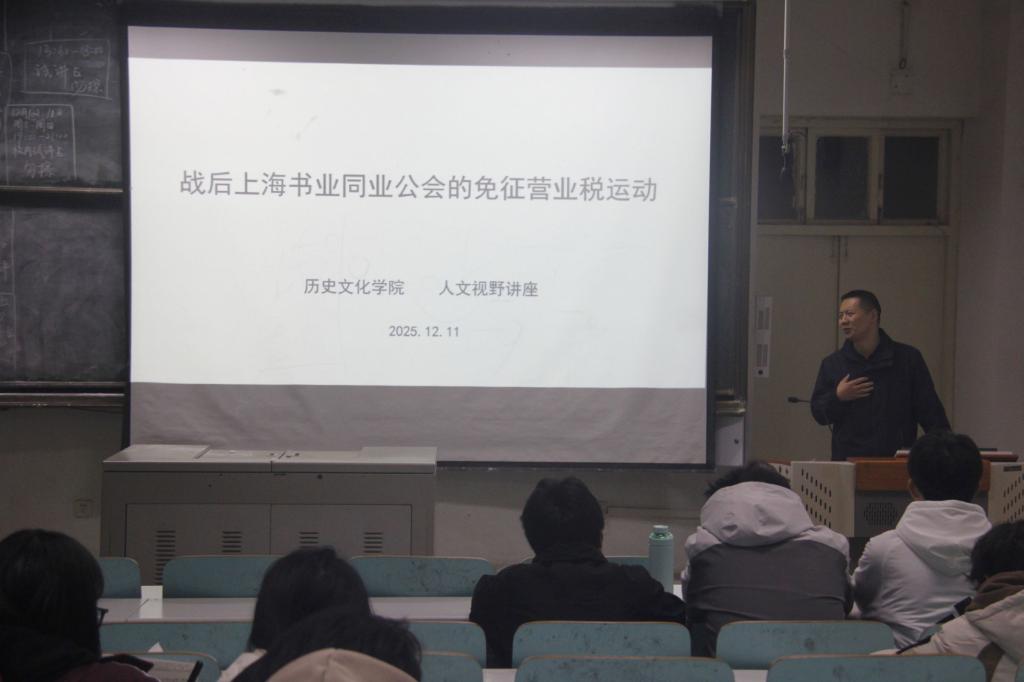 12月11日晚,李曉波博士在人文樓609為我院學(xué)生開展題為“戰(zhàn)后上海書業(yè)同業(yè)公會(huì)的免征營業(yè)稅運(yùn)動(dòng)”的學(xué)術(shù)講座,我院2025級(jí)學(xué)生到場聽講。