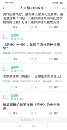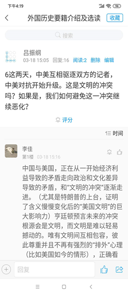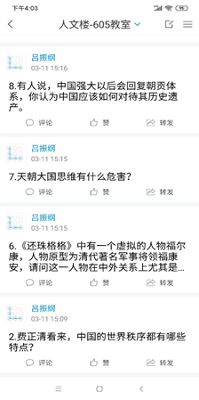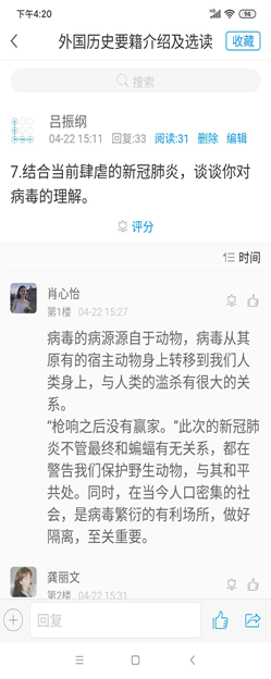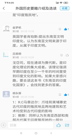 第三,加強(qiáng)互動(dòng),鼓勵(lì)拓展式學(xué)習(xí)。每一次上課,呂老師都會(huì)在討論區(qū)準(zhǔn)備6至10個(gè)問題,這些問題涵蓋所講解內(nèi)容的背景、主旨、觀點(diǎn)及不足等各方面,鼓勵(lì)學(xué)生積極進(jìn)行回答。同時(shí),他本人也積極參與其中,對(duì)相關(guān)的答案進(jìn)行點(diǎn)評(píng)。為拓展學(xué)生的知識(shí)面,呂老師有意在相關(guān)問題下引入更多信息,啟發(fā)學(xué)生思考,鼓勵(lì)學(xué)生尋找相關(guān)領(lǐng)域的更多書籍尋找答案。每一節(jié)課的學(xué)習(xí),都會(huì)讓學(xué)生們體會(huì)到知識(shí)的整體性和拓展性,激發(fā)大家的自主學(xué)習(xí)意識(shí),讓人有滿滿的收獲感。