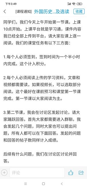 第一,建立網(wǎng)課授課規(guī)則,減少不確定因素。在第一節(jié)網(wǎng)課之前,呂老師就在學(xué)習(xí)通平臺(tái)上向全體學(xué)生發(fā)郵件說明了網(wǎng)課規(guī)則,這些規(guī)則涉及到學(xué)校及學(xué)院的基本要求和他認(rèn)為這門課應(yīng)該做到的內(nèi)容,比如學(xué)習(xí)成績(jī)積分的計(jì)算、簽到規(guī)則、課堂時(shí)間的分配、互動(dòng)及討論的原則等。從一開始就盡可能減少不確定因素,讓同學(xué)們做到心里有數(shù),這使得整個(gè)網(wǎng)課有了一個(gè)統(tǒng)一的形式。