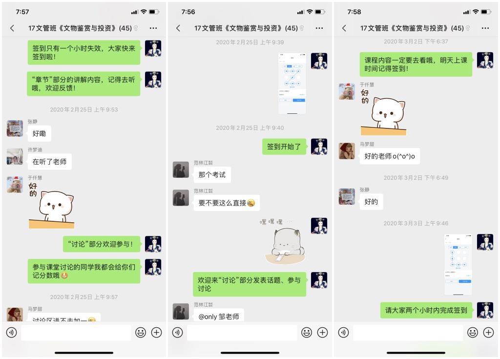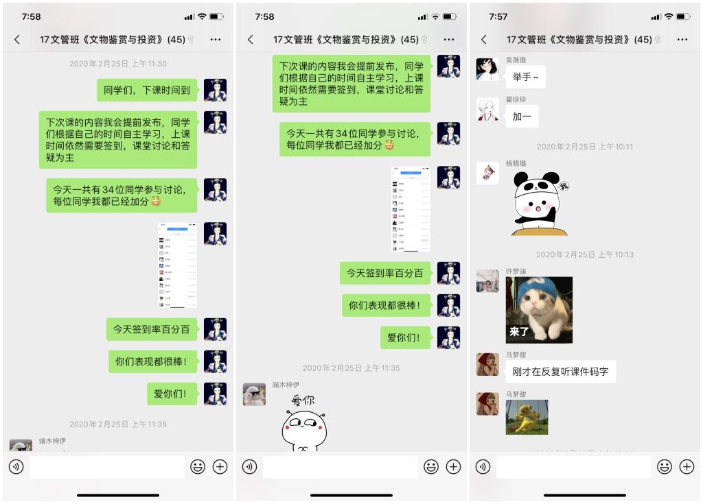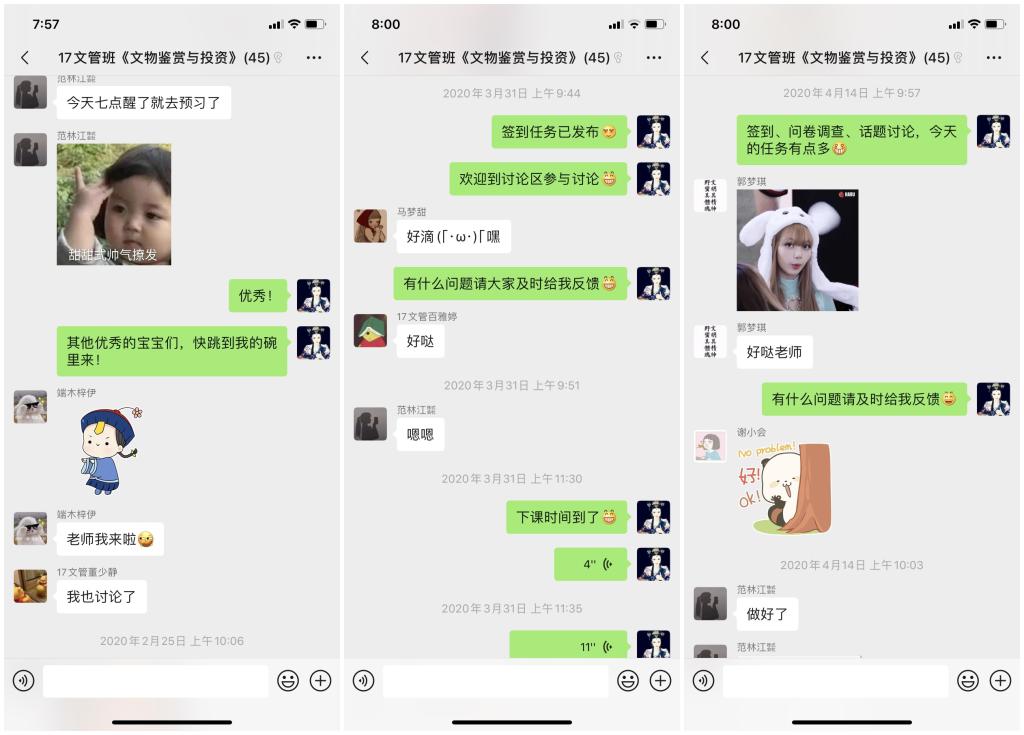 同時,為了保證所有同學(xué)都能有效地利用線上教學(xué)資源,開課前,她建立了班級微信群,反復(fù)跟班內(nèi)同學(xué)溝通開課時間、課堂要求、學(xué)習(xí)任務(wù)等,最終形成了利用微信群發(fā)布課程預(yù)告、利用學(xué)習(xí)通發(fā)布作業(yè)、測試等學(xué)習(xí)任務(wù),并錄制速課、上傳課件、組織課堂討論等學(xué)習(xí)模式,從2月份開始第一次網(wǎng)上授課以來,便受到了學(xué)生們的熱烈歡迎。