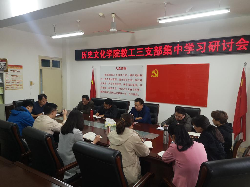 根據(jù)歷史文化學(xué)院“不忘初心、牢記使命”主題教育活動(dòng)方案,10月22日下午,學(xué)院教職工第三黨支部在黨員之家開(kāi)展了“不忘初心、牢記使命”集中學(xué)習(xí)研討會(huì),院黨委書(shū)記李軍輝同志以普通黨員的身份參加了此次研討會(huì)。
