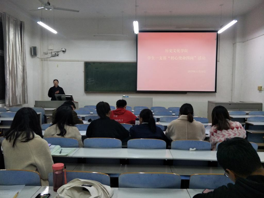 根據(jù)我院黨委要求,11月18日晚,學(xué)生一支部全體黨員在人文樓605教室開展了“初心使命四問” 主題黨日活動。
