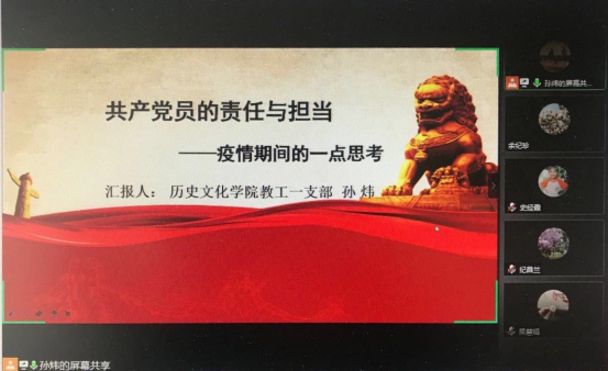 本次黨課由黨委副書記劉喜元同志主持,教工一支部書記孫煒同志主講。孫煒同志圍繞共產(chǎn)黨員的責任與擔當,從學習習近平總書記關(guān)于責任與擔當?shù)年U述、向疫情期間抗疫前線的優(yōu)秀共產(chǎn)黨員致敬、對照習近平總書記要求與優(yōu)秀共產(chǎn)黨員表率的反思、我院教工黨員在疫情期間的認真工作表現(xiàn)出發(fā),做了題目為《共產(chǎn)黨員的責任與擔當—疫情期間的一點思考》的黨課,全體教工黨員認真聆聽。