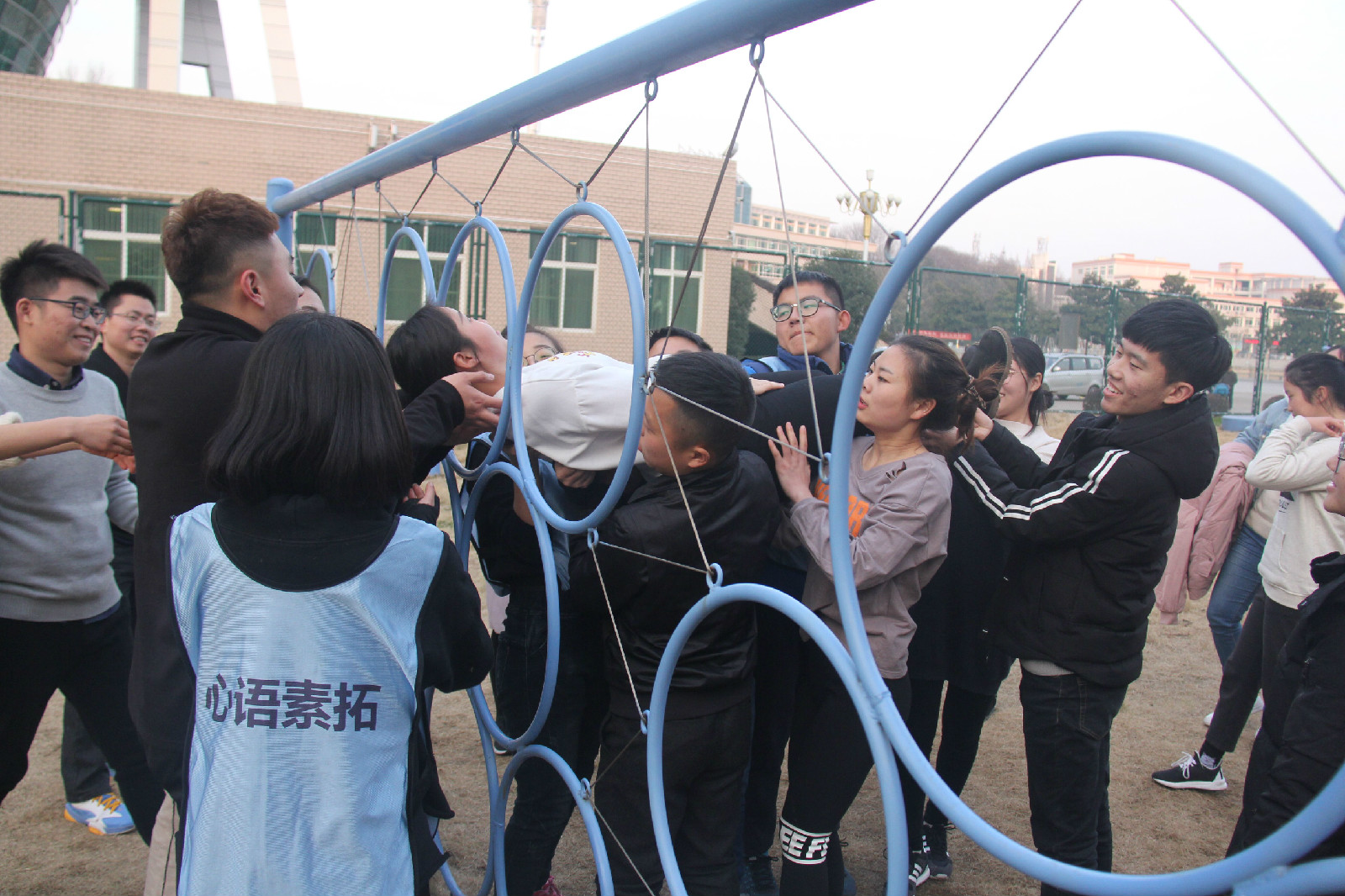 在專業(yè)老師的指導(dǎo)下,所以學(xué)生分成三隊(duì),分別進(jìn)行了高空斷橋活動(dòng)和模擬電網(wǎng)活動(dòng)。首先是高空斷橋活動(dòng),由學(xué)生站在高空的踏板上,眼睛注視前方,完成起步、跨越、落地等動(dòng)作。這一活動(dòng)有利于鍛煉和培養(yǎng)學(xué)生勇于挑戰(zhàn)和突破自我的能力和精神。接著是模擬電網(wǎng)活動(dòng),這一活動(dòng)旨在培養(yǎng)學(xué)生們的團(tuán)隊(duì)協(xié)作能力以及團(tuán)隊(duì)內(nèi)部的良好工作作風(fēng)。在活動(dòng)中,每名學(xué)員只能鉆一個(gè)電網(wǎng),不得重復(fù),不得觸及電網(wǎng),不得發(fā)出聲音,并尋求過電網(wǎng)的最佳方法。最后,同學(xué)們還在青年廣場一起玩了割繩子等群體游戲。