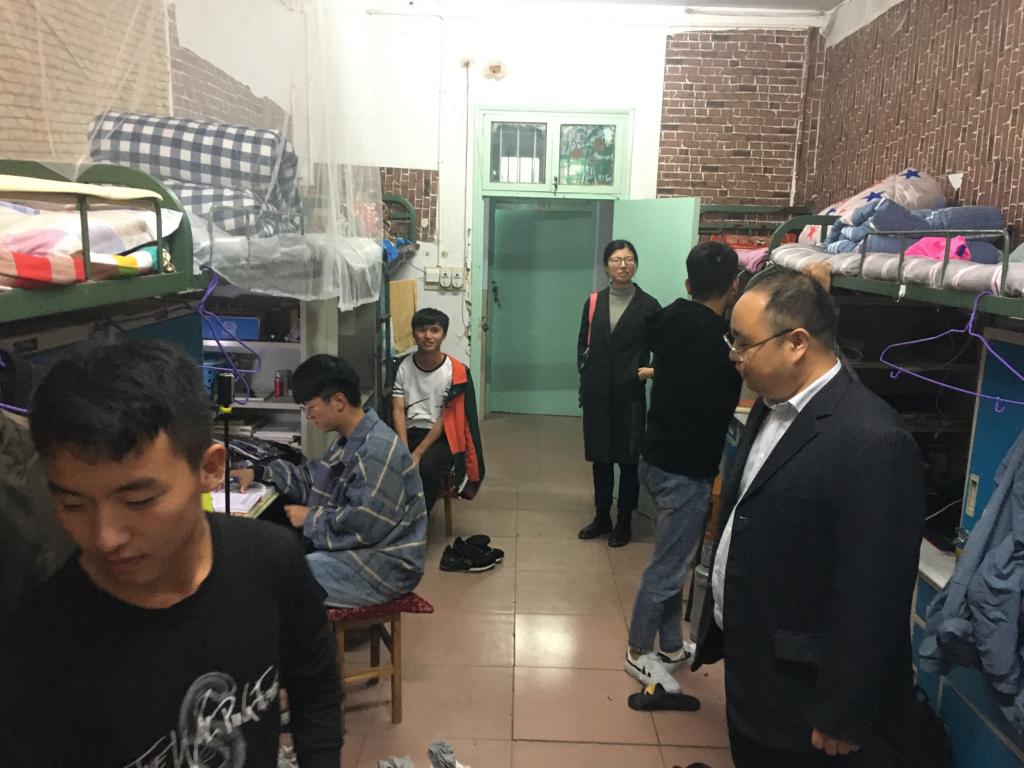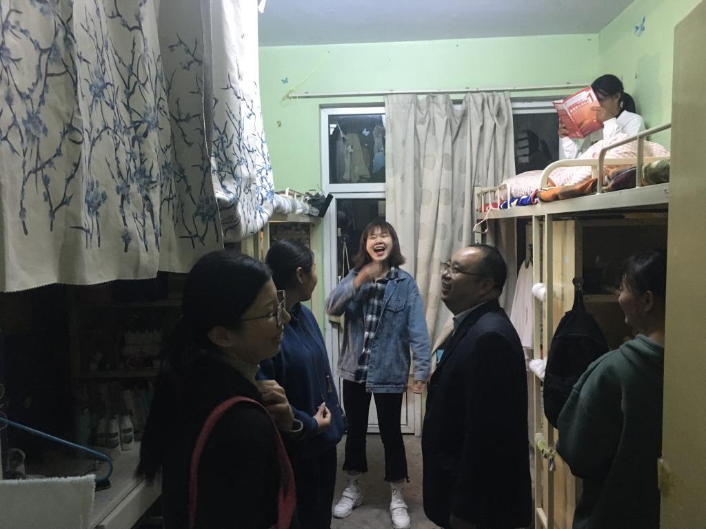 輕輕宿舍行,暖暖關(guān)懷意。在冬季來(lái)臨之際,我院黨委副書(shū)記劉喜元、輔導(dǎo)員王道歆、付亞男于11月6日晚到2019級(jí)宿舍進(jìn)行走訪檢查。