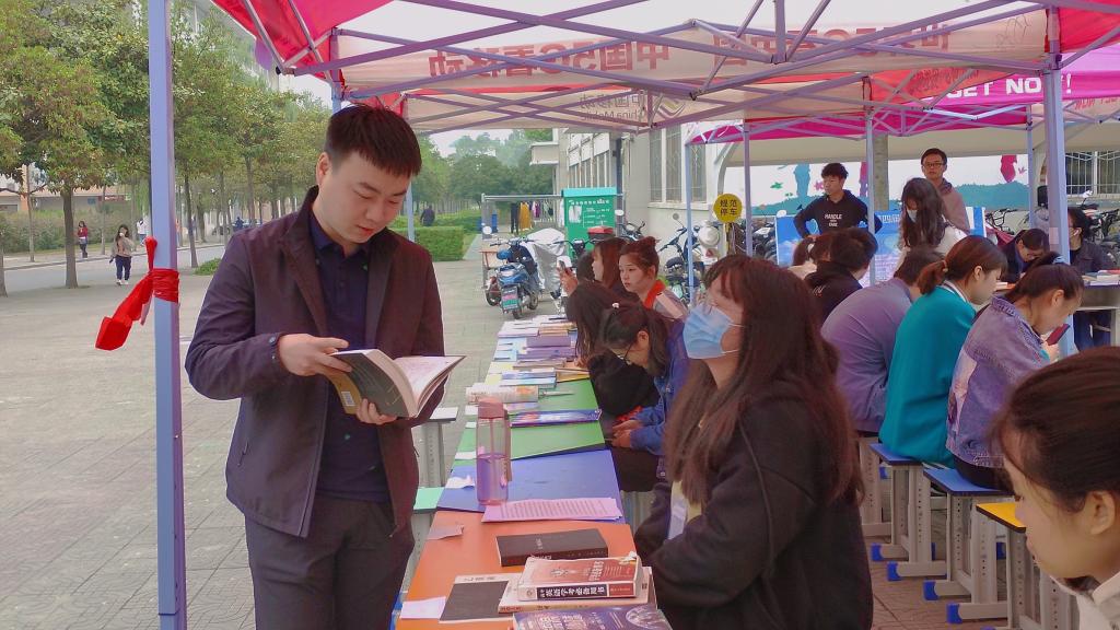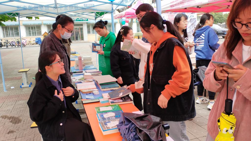 立身以立學為先,立學以讀書為本。為滿足大學生對書籍閱讀的渴望,4月24日,我院聲音文學社在八餐小廣場上舉辦第四屆大學生淘書節(jié)活動。我院卞卡、姚磊、李國東三位老師蒞臨現(xiàn)場指導工作。