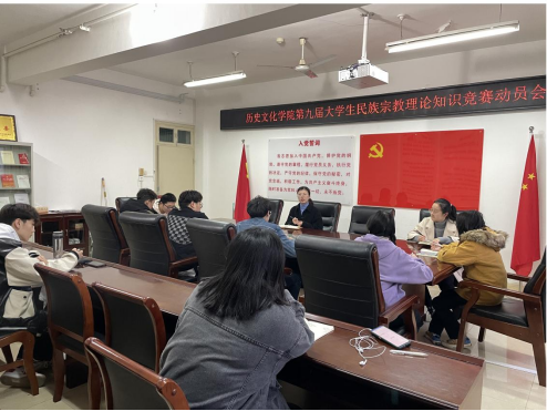 為加強(qiáng)中國特色社會主義民族宗教理論、黨的民族宗教政策和國家有關(guān)法律法規(guī)的宣傳教育,有效組織我院學(xué)生參加全省高校第九屆大學(xué)生中國特色社會主義民族宗教理論知識競賽,11月16日,我院于人文樓805會議室召開宗教知識競賽學(xué)生干部動員大會。團(tuán)委老師付亞男及各班班委參與會議。