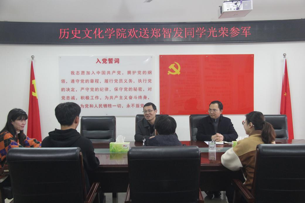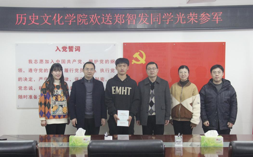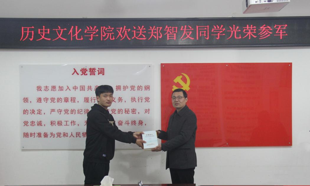 3月3日下午,我院在人文樓805舉行歡送2021級(jí)學(xué)生鄭智發(fā)光榮入伍儀式,學(xué)院黨委書(shū)記李輝、黨委副書(shū)記韓志宏、輔導(dǎo)員班主任吳慧娟、付亞男、鄧皓與會(huì)。領(lǐng)導(dǎo)老師們表達(dá)了對(duì)鄭智發(fā)同學(xué)的祝賀,并送上《平語(yǔ)近人——習(xí)近平總書(shū)記喜歡的典故》《平易近人——習(xí)近平的語(yǔ)言力量》《平易近人——習(xí)近平的語(yǔ)言力量之軍事卷》《中國(guó)古代軍事通識(shí)課》等書(shū)籍,希望他刻苦訓(xùn)練,勤于學(xué)習(xí),文武兼修,報(bào)效祖國(guó)。