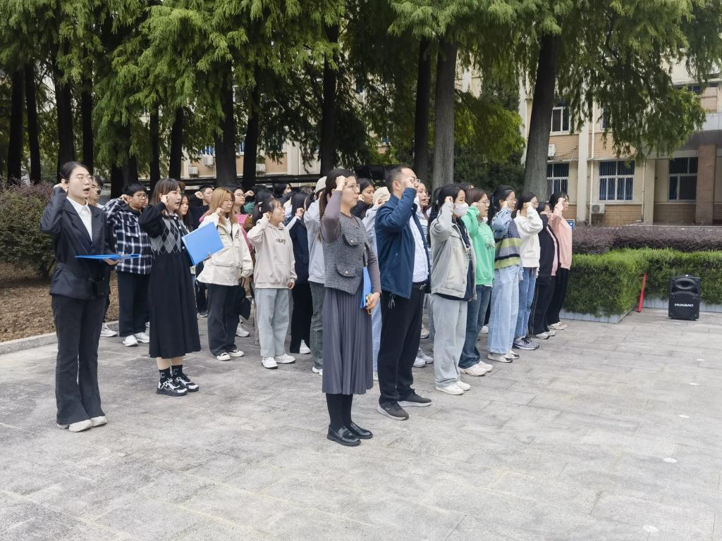 迎著朝陽,國旗護衛(wèi)隊邁著鏗鏘有力、整齊劃一的步伐護送五星紅旗至升旗臺。伴隨著激昂雄壯的《義勇軍進行曲》,五星紅旗在晨光中冉冉升起,全體師生行注目禮,奏唱國歌,為祖國獻上最真摯的祝福。接著團員代表梁馨緣發(fā)言,表達了新時代青年生逢盛世,青春正當時,應當用青春之火創(chuàng)造輝煌之情。緊接著付亞男進行了國旗下的講話,她勉勵新生要努力學習,踔厲奮發(fā),成為堪當大任的時代新人。在新生代表王伯煜的領(lǐng)誓下,全體師生舉起右拳,面向國旗莊嚴宣誓,一句句鏗鏘的誓言彰顯了我院師生積極進取、昂首向上的精神面貌。最后,全體師生齊唱《黃河大合唱》,“保衛(wèi)家鄉(xiāng)……保衛(wèi)全中國”,歌聲嘹亮,熱血沸騰。
