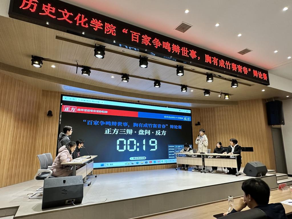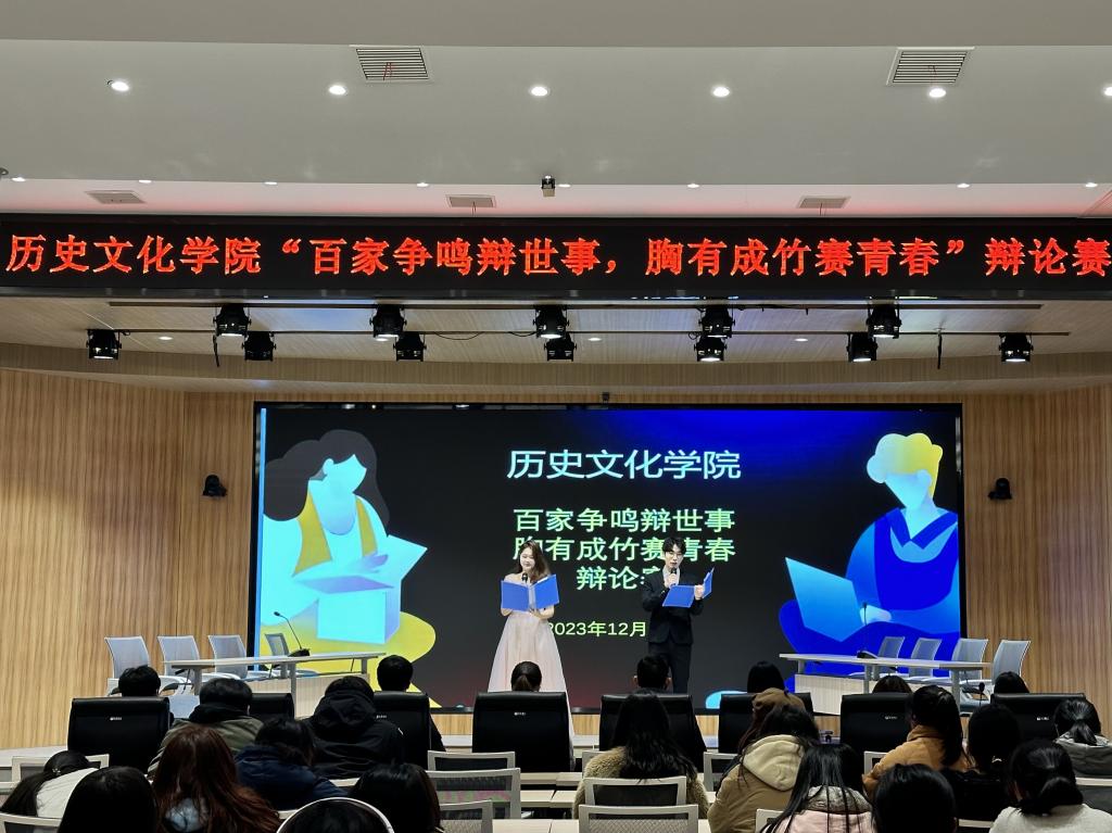 為提升大學(xué)生思辨能力、語言表達(dá)能力和邏輯思維能力,歷史文化學(xué)院于12月11日在譚山報(bào)告廳舉辦了“百家爭(zhēng)鳴辯世事,胸有成竹賽青春”辯論賽,學(xué)院黨委副書記韓志宏、團(tuán)委書記付亞男及百余名學(xué)生到場(chǎng)觀賽。